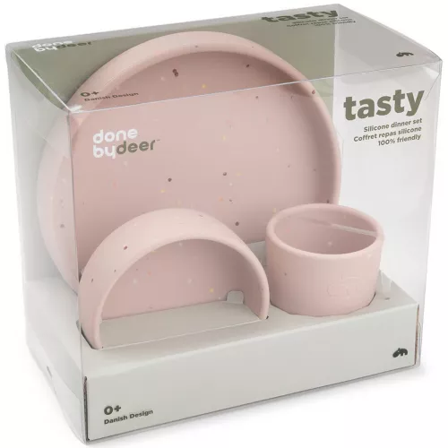 De eetset bestaande uit een bord, een kommetje en een mok is speciaal ontworpen voor kleine eters. Het roze kinderservies is gemaakt van siliconen, hierdoor is het servies anti-slip en heeft het een fijne grip. Ontbijt, lunch of avondeten… maak van elke maaltijd een feestje met dit confetti servies!