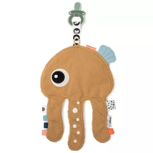 De troeteldoek heeft twee zijden van verschillende stof en is gemaakt om ontdekt te worden. Zowel thuis als onderweg kunnen baby’s zich vermaken met het onderzoeken van de verschillende materialen en labeltjes. Komen de tandjes door dan biedt het bijtspeeltje op Jelly’s rug soelaas. Fopspenen worden makkelijk bevestigd aan de gespikkelde band of het elastieken lusje aan Jelly’s hoofd.