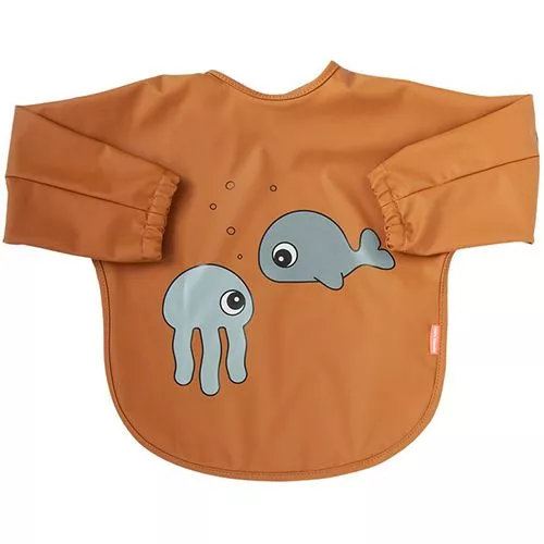 Een waterafstotend kinderslabbetje met mouwen ‘Sleeved Bib 6-18 mnd – Sea Friends, Mustard’ van het Deense merk Done by Deer.