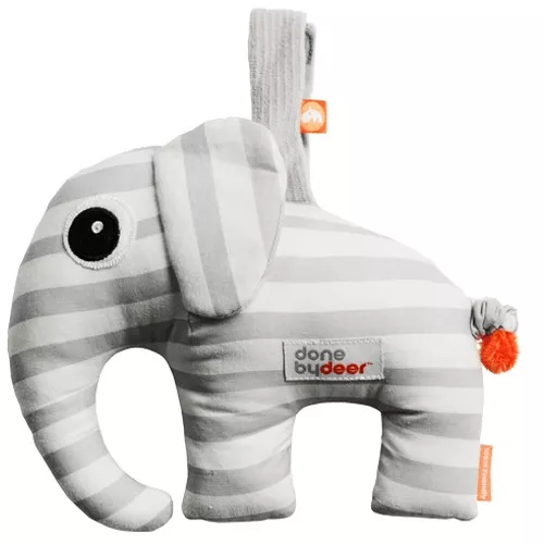 Het muziekdoosje olifant Elphee van het Deense merk Done by Deer laat zachtjes het slaapliedje ‘Over the rainbow’ horen als er aan zijn vrolijke oranje staart getrokken wordt. Deze stevige, maar zachte olifant houdt ook van een knuffel. Hij heeft grote flaporen en hij houdt ervan als hij in zijn slurf geknepen wordt.