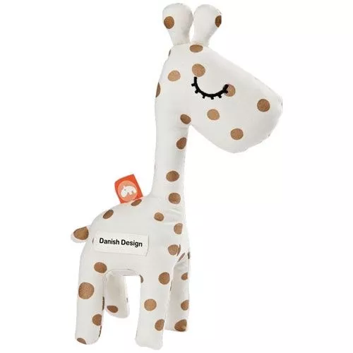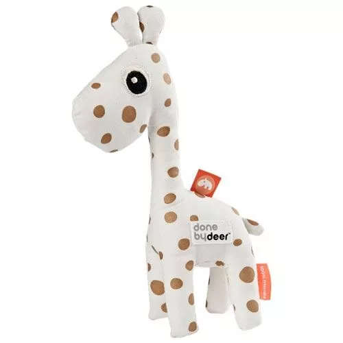 Deze zachte, stoffen rammelaar Raffi Rattle van het Deense merk Done by Deer houdt ook van knuffelen. In haar buik heeft zij een zacht rammeltje, dat is leuk! Haar vriendelijke blik en knipoog en de glinsterende gouden stippen maken haar een geliefde knuffelrammelaar.