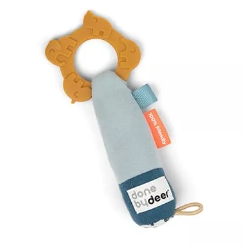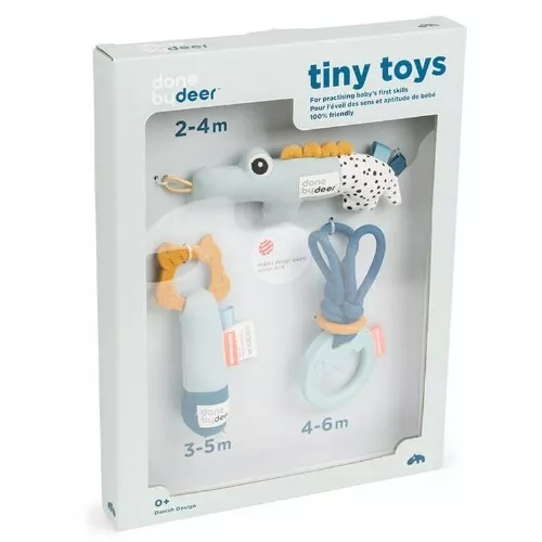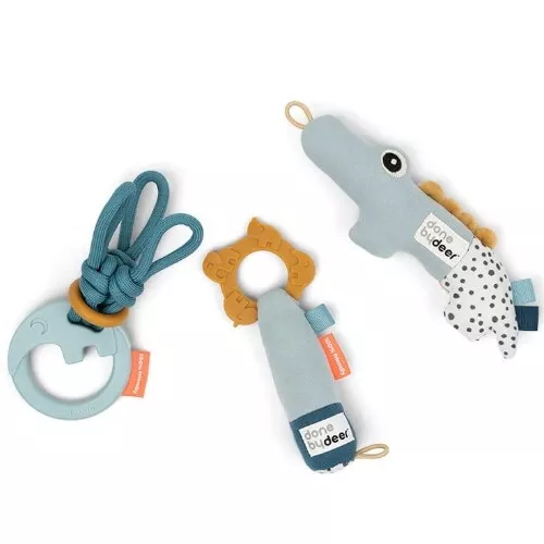 Activiteitenspeeltjes ‘Tiny Activity Deer Friends, Blue’ van het Deense merk Done by Deer hebben alles in zich om favoriet babyspeelgoed te worden. De set bestaat uit drie rammelaars met verschillende vormen, texturen en zachte kleuren.