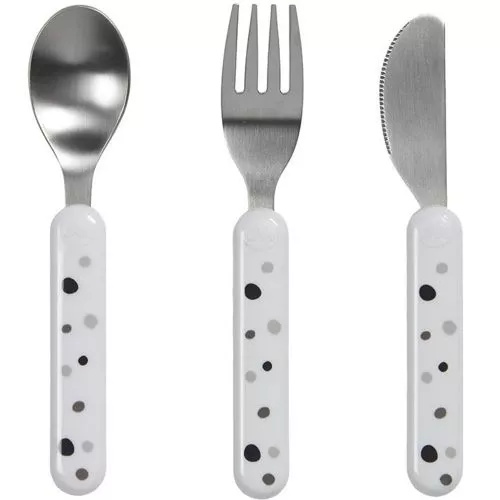 De kindereetset bestaat uit een metalen lepel, mes en vork met uitnodigend stippendessin op de handvatten.
