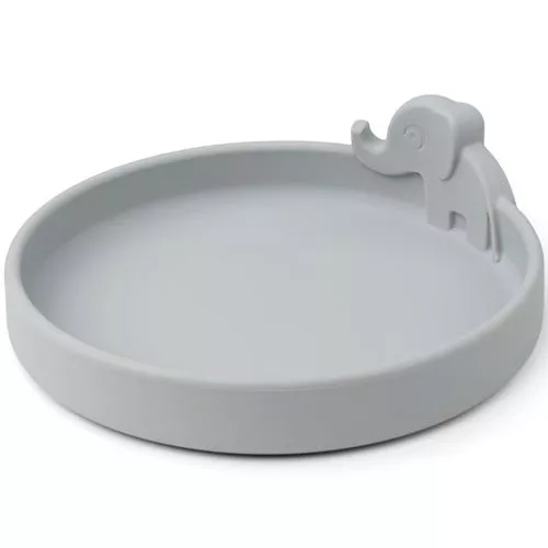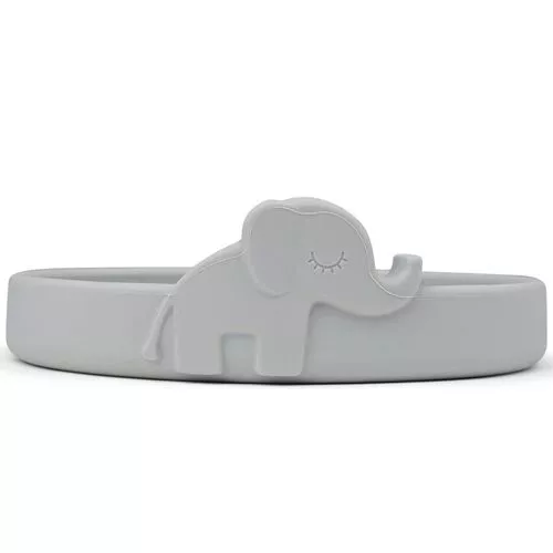 Elphee de olifant op het kinderbord ‘Peekaboo plate Elphee’ moedigt kinderen aan bij de eerste hapjes. Het antislip bord van het Deense merk Done by Deer heeft aan de binnenkant een afgeronde rand, wat helpt bij het leren scheppen.