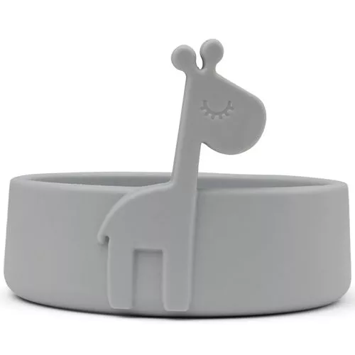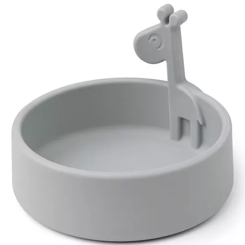 Raffi de giraf op de kinderkom ‘Peekaboo bowl Raffi’ moedigt kinderen aan bij de eerste hapjes. De antislip kom van het Deense merk Done by Deer heeft hoge en afgeronde binnenranden wat helpt bij het leren scheppen.