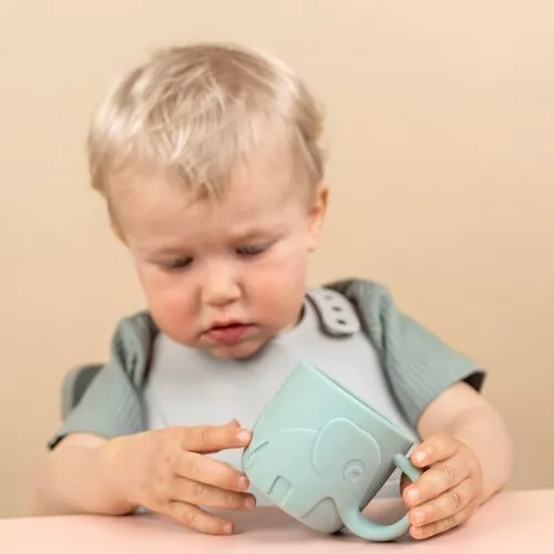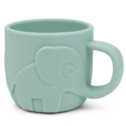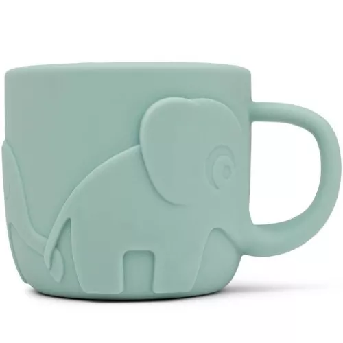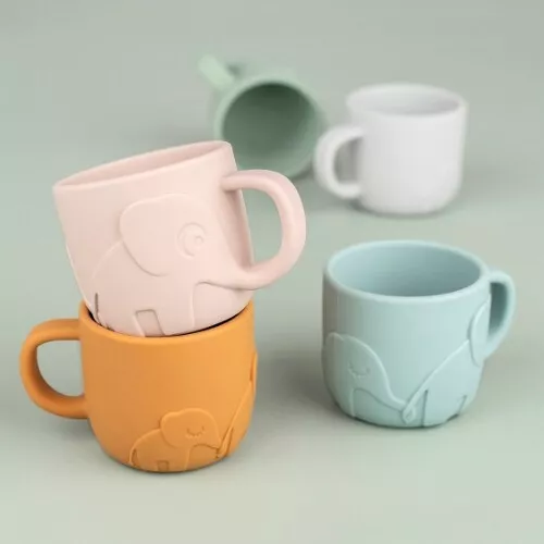 Een siliconen kinderbeker ‘Peekaboo Cup Elphee’ van het Deense merk Done by Deer. Met lieflijke 3D-figuurtjes op de buitenkant van de drinkbeker.