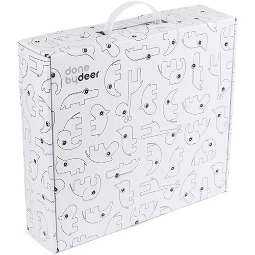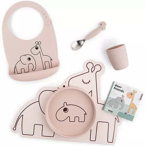 De eetset bestaat uit een beker, een slabbetje met voorvakje, een bord, een lepel en een placemat. Het servies wordt geleverd met een boekje ‘Deer Friends’ en is verpakt in een mooie, stevige geschenkdoos met handvat.