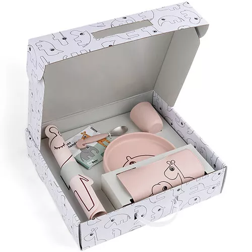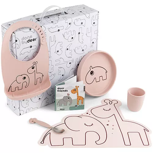 Is er een meisje geboren, dan wordt het al snel tijd voor haar eerste servies. Deze cadeauset ‘Dinner Time Goodie Box – Powder’ van het Deense merk Done by Deer met een siliconen kinderservies met de dierenvriendjes is een mooi welkomsgeschenk .