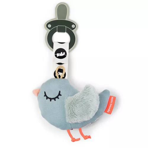 Een aaibare speenhouder ‘Cozy Keeper Birdee – Blue’ van het Deense merk Done by Deer in de vorm van een vrolijk vogeltje. Met aan beide zijden een verschillend dessin: een rijke blauwe kleur en zwart-witte stippen.