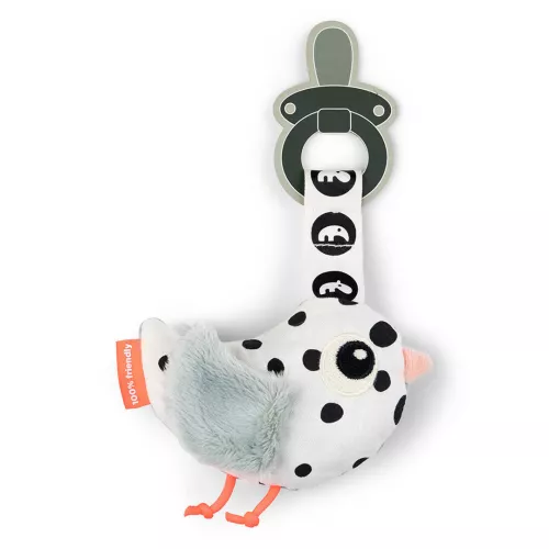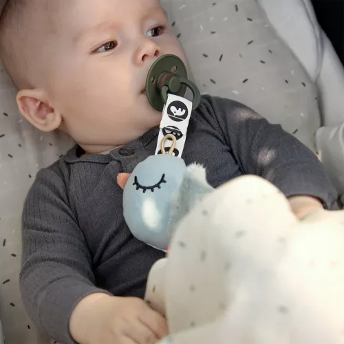 De speenknuffel heeft een klittenbandje om de speen aan te bevestigen.