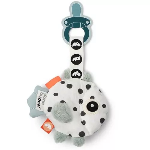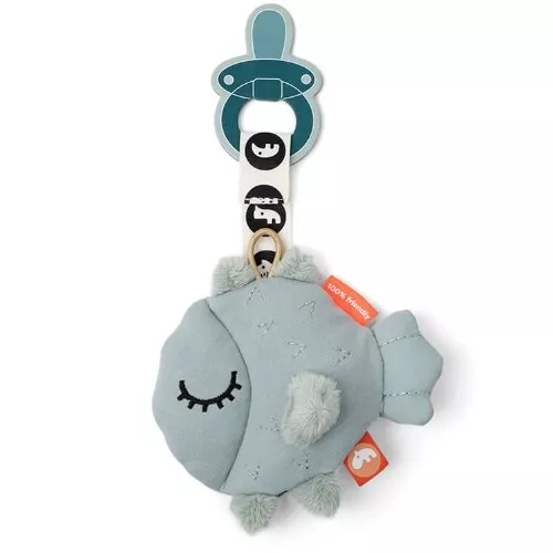 Een aaibare speenhouder ‘Cozy Keeper – Puffee, Blue’ van het Deense merk Done by Deer in de vorm van een bolrond visje. Met aan beide zijden een verschillend dessin: zachtblauw en zwart-wit gestippeld.